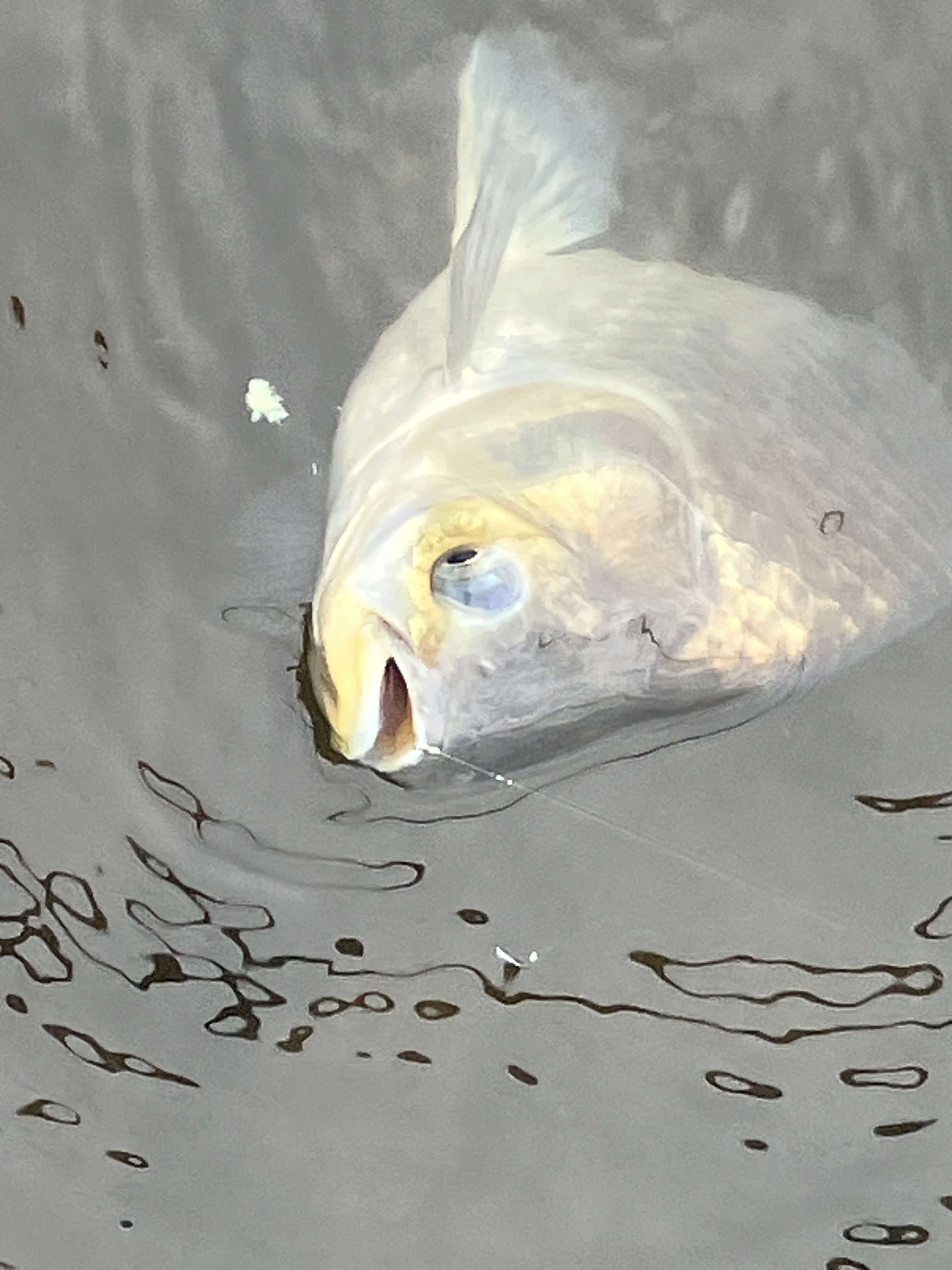 食いが渋そうなので型を見ることを目標にエサ打ちを開始する。20分程で弱いサワリが出たがジャミなのか強いアタリに繋がらず、30分後に前触れなくトップが消し込みヒット。強烈な魚信で竿が大きく曲がり、一瞬スレかと思ったが40cmクラスが下バリをガッチリ咥え上がって来た。