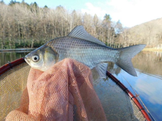 前日の降雪と早朝の冷え込みで冷たい水が底付近に流れ込んだためなのか、クワセエサにへら鮒の口を誘導することがかなり難しかったが、バラケエサの打ち過ぎに気を付けながら1投2分程度かけてゆっくりとエサを打ち返し、バラケエサが抜けてからしばらく経ったころに出るアタリで釣り込んでいった。
