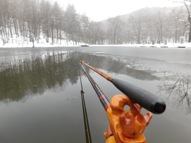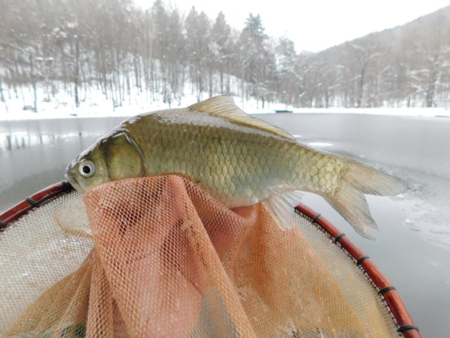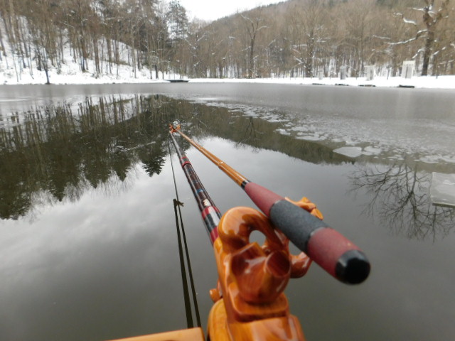 段差の底釣りでスタートしたが、池面に張った氷が徐々に解けだしたことから、冷たい水が底付近に流れ込んだためなのか、時間を追うにしたがってへら鮒のタナが上がってしまい、くわせエサにへら鮒の口を誘導することがかなり難しかったため、午前11時過ぎに浅ダナセットにチェンジした。