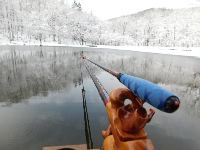 池面に張った氷が徐々に解け、冷たい水が底付近に流れ込んだためなのか、時間を追うにしたがって、へら鮒のタナが上がってしまい、へら鮒の口を底に向けることが難しかったが、下ハリスを最終的に60cmまで伸ばしたところ釣況が上向きだした。