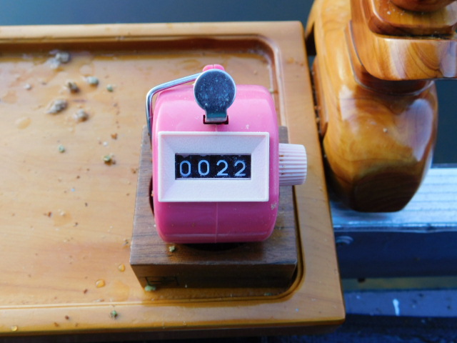 竿 12尺(シマノ皆空) 道糸 0.6号(ダンへら名人鑠) ハリス上 0.4号 - 7cm(ダンへら名人鑠ハリス) ハリス下 0.2→0.15号 - 50→55→60cm(ダンセラミックへらハリス底) ハリ 上 6号(がまかつ改良ヤラズ) ハリ 下 1→3号(1号:がまかつコム→3号:がまかつイズナ) ウキ 吉田作 ボトムゼロPC(ボディ8.5cmPCムクトップノーマル)