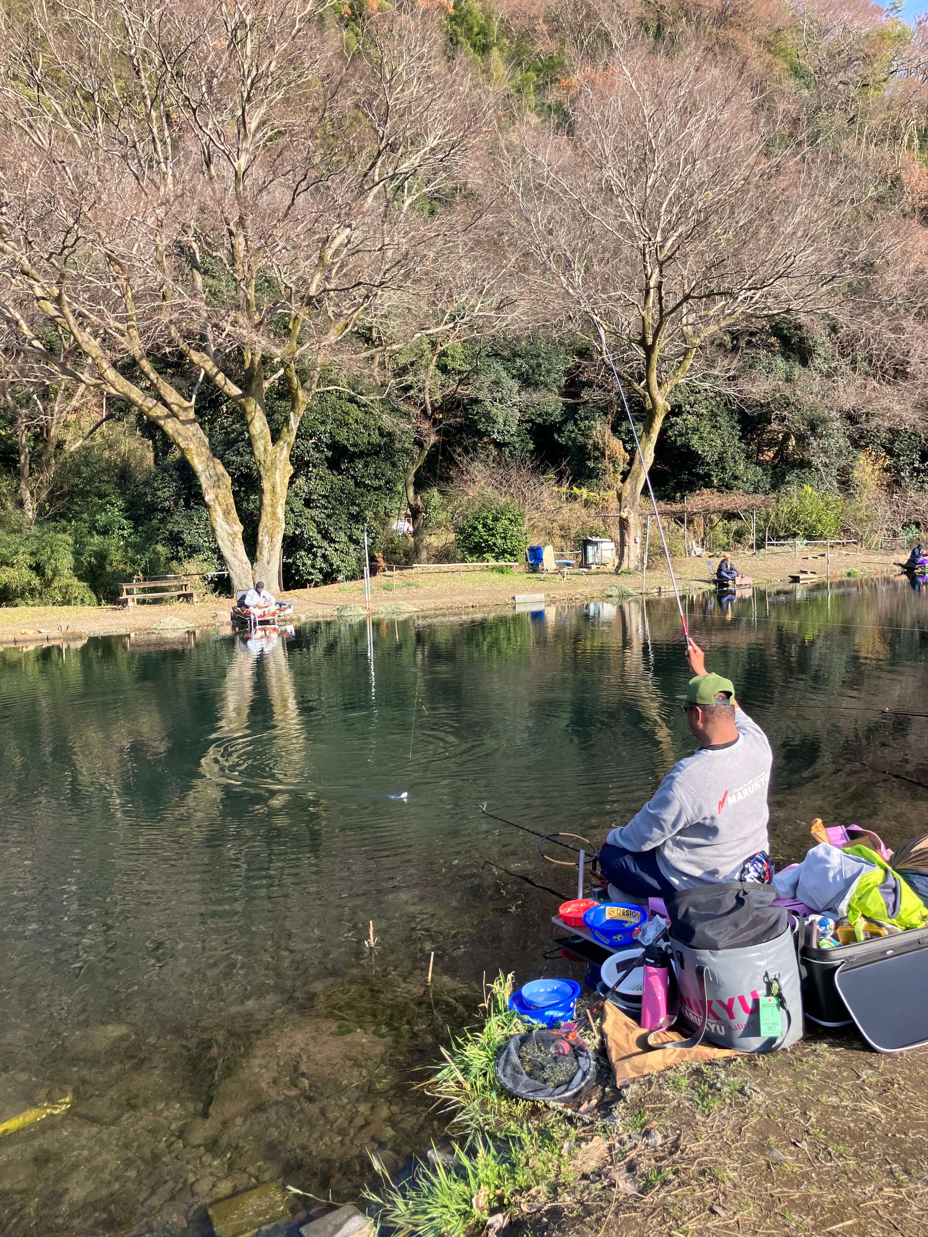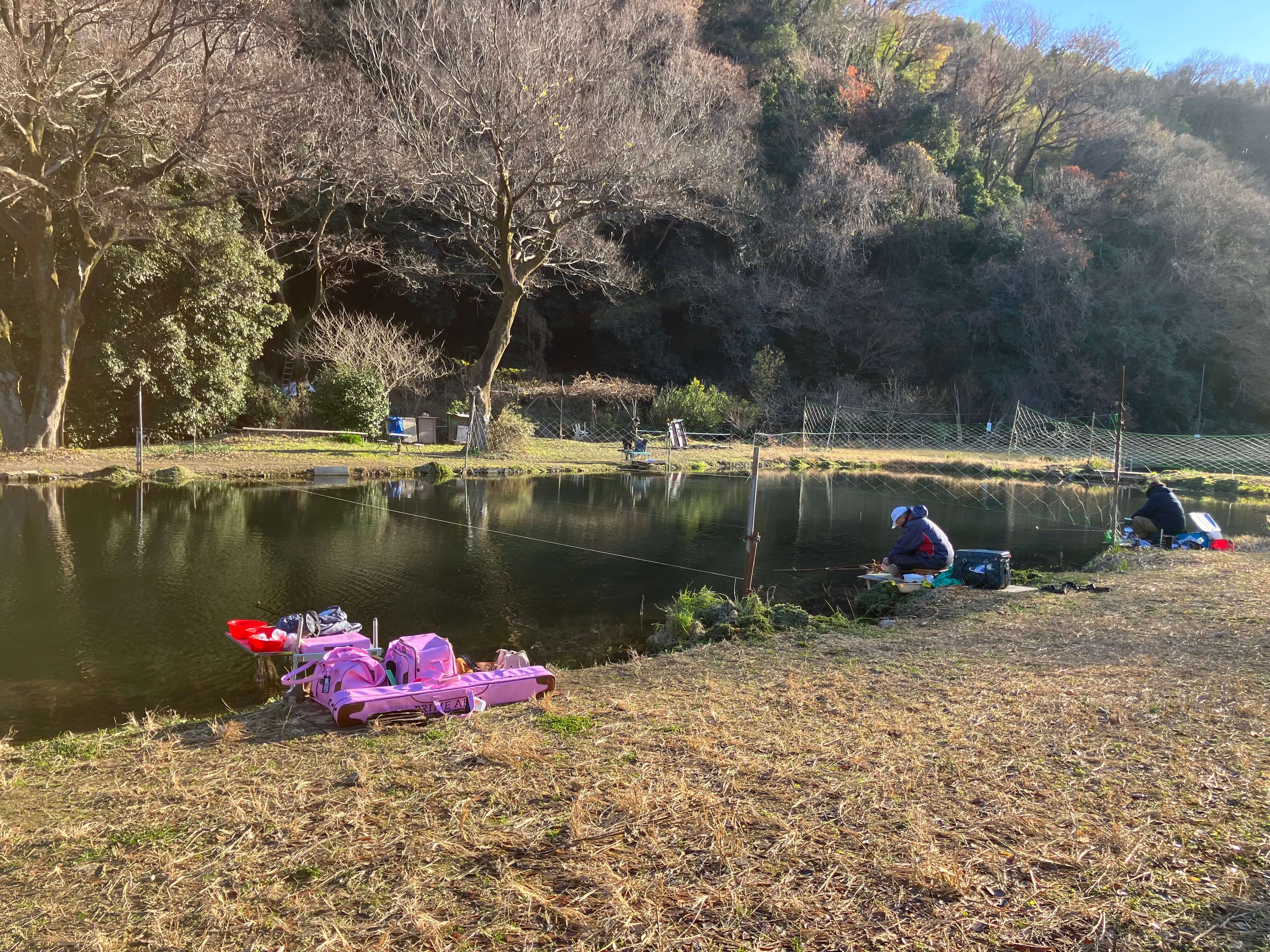 7時前に現地に着くと2人の釣り人が河川側で支度をしていた。池を見ると3箇所にカワウ避けのネットが張られていた。水面を見ると表層近くにへら鮒の大群が見える。河川側の入り口寄りに入りS氏と並ぶ。
