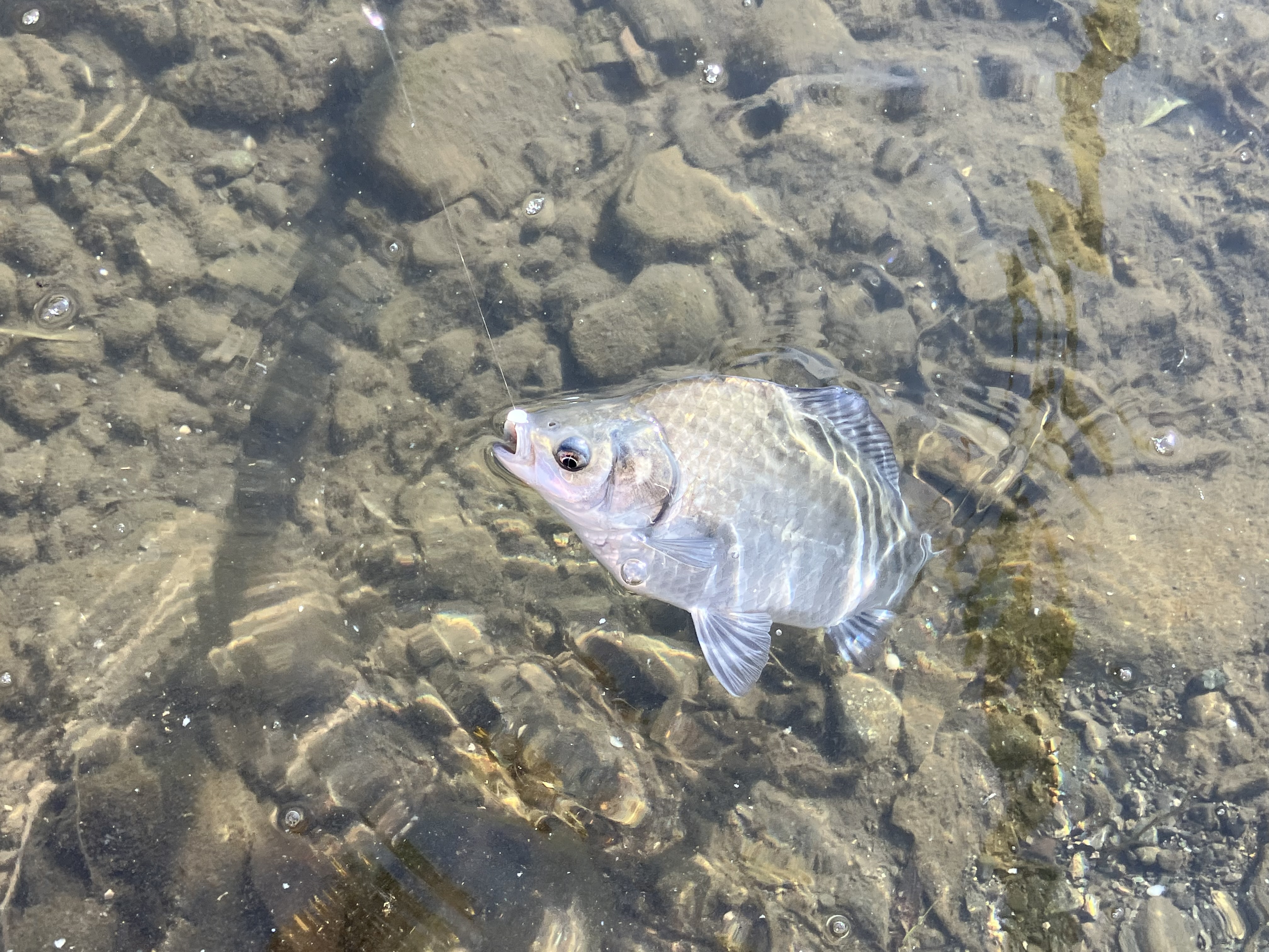 打ち始めはウキが動かなかったが、20分程ナジミ切りを繰り返すとエサ打ち地点で魚影が見えるようになった。しかし、水温が低い為か魚は居るがウキが動かず、PCムクのウキからグラスムクに交換すると弱いサワリが続き、ポツリポツリと釣れ出した。