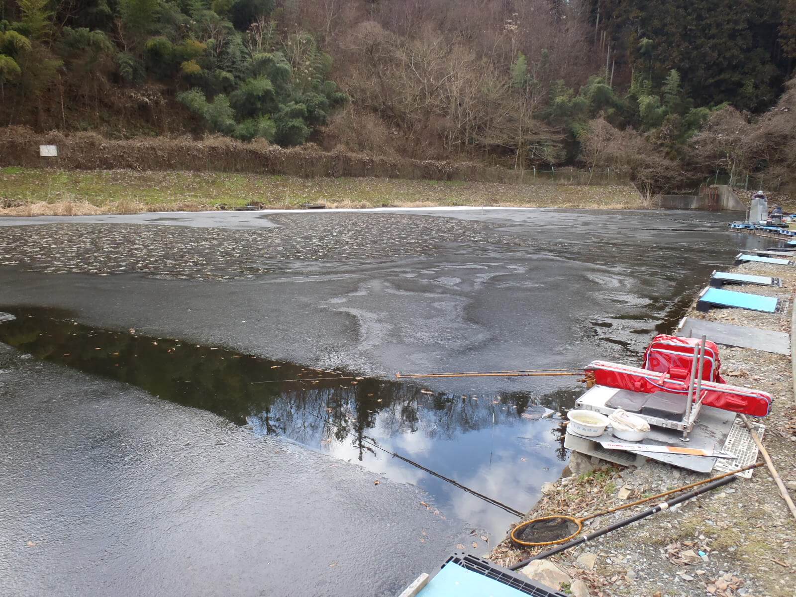 当日は全面に氷が張っていましたが、気温が高く、氷が溶けて水温が低下しました。