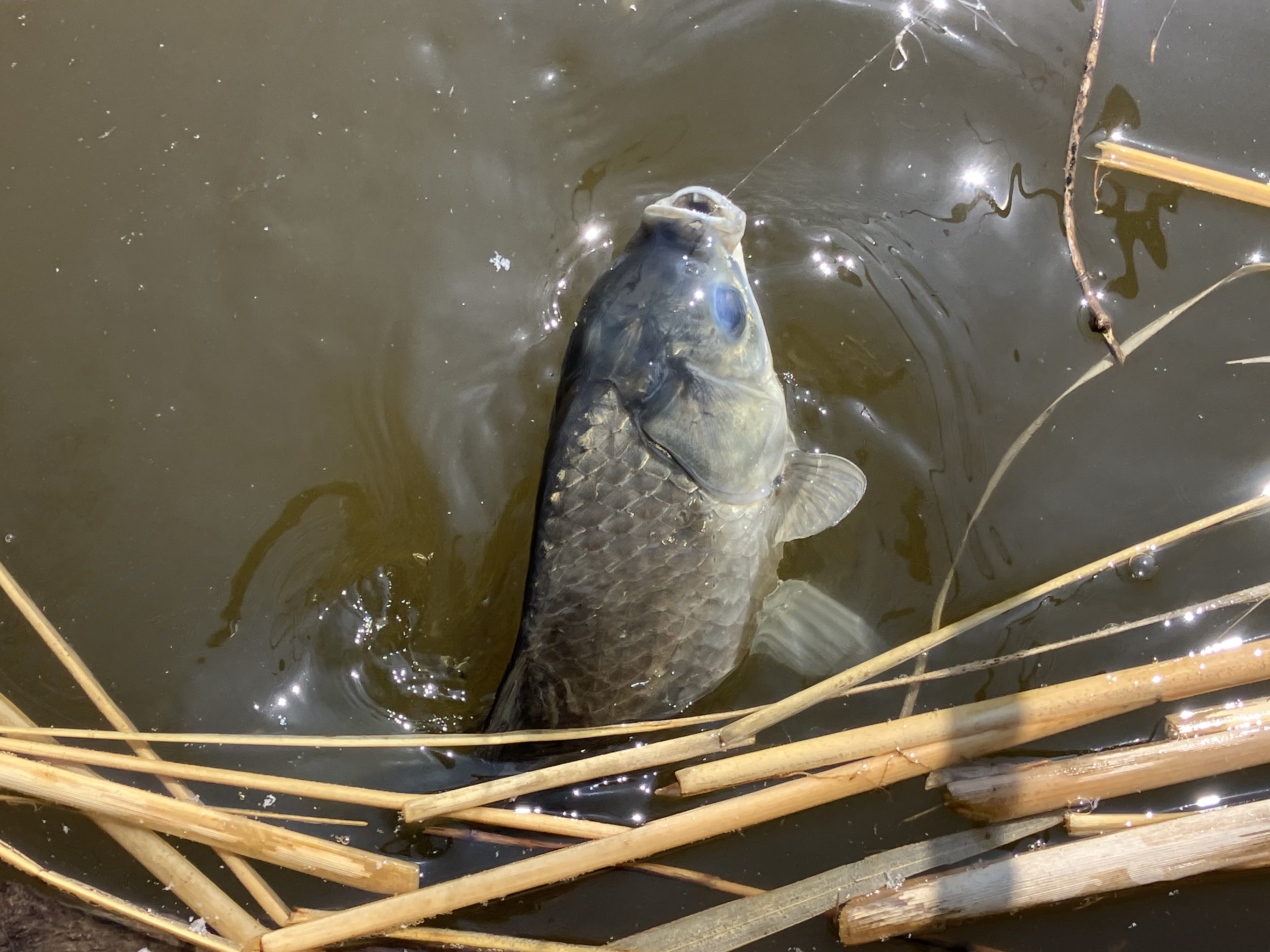 その後もマブナの動きが活発で、13時前に30cmの半べらが釣れた後に35cmのへら鮒が釣れた。