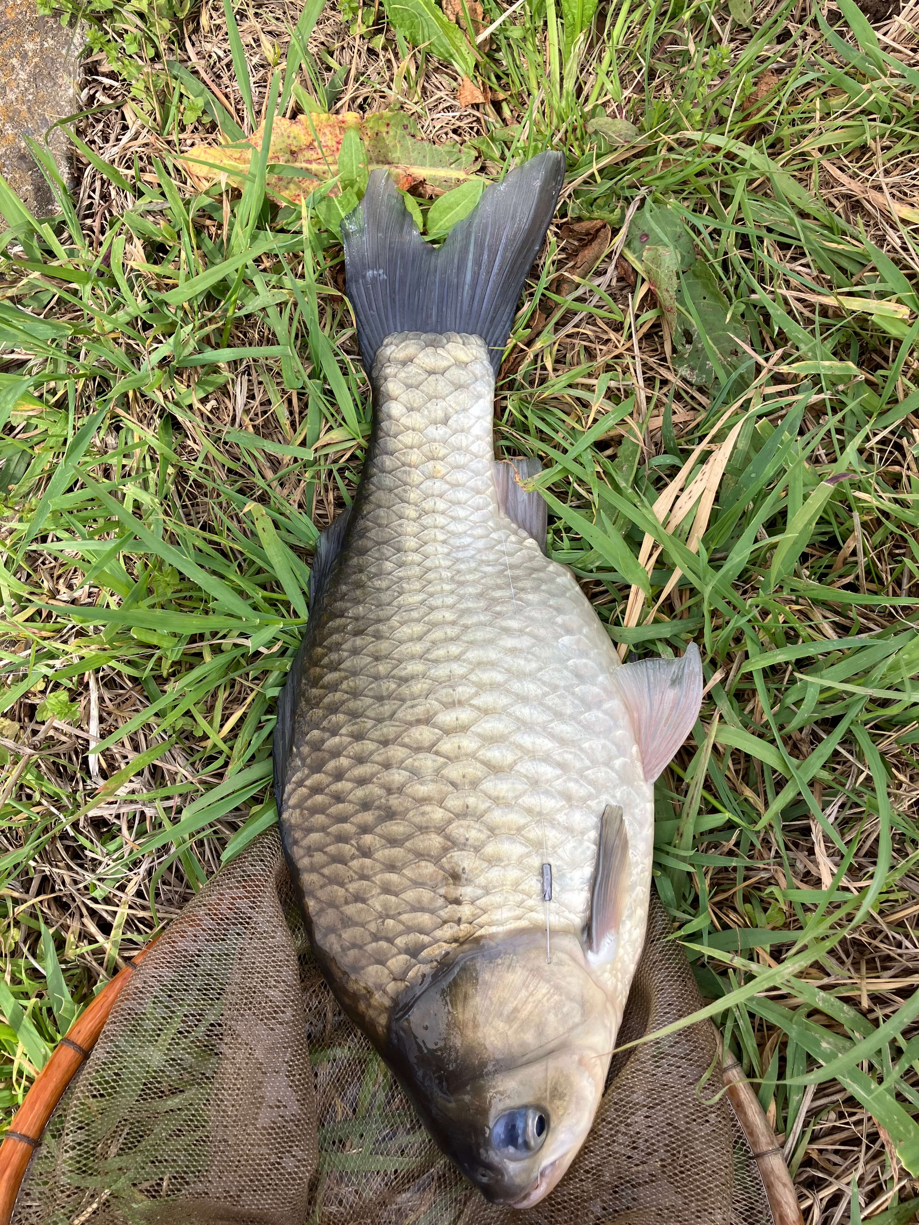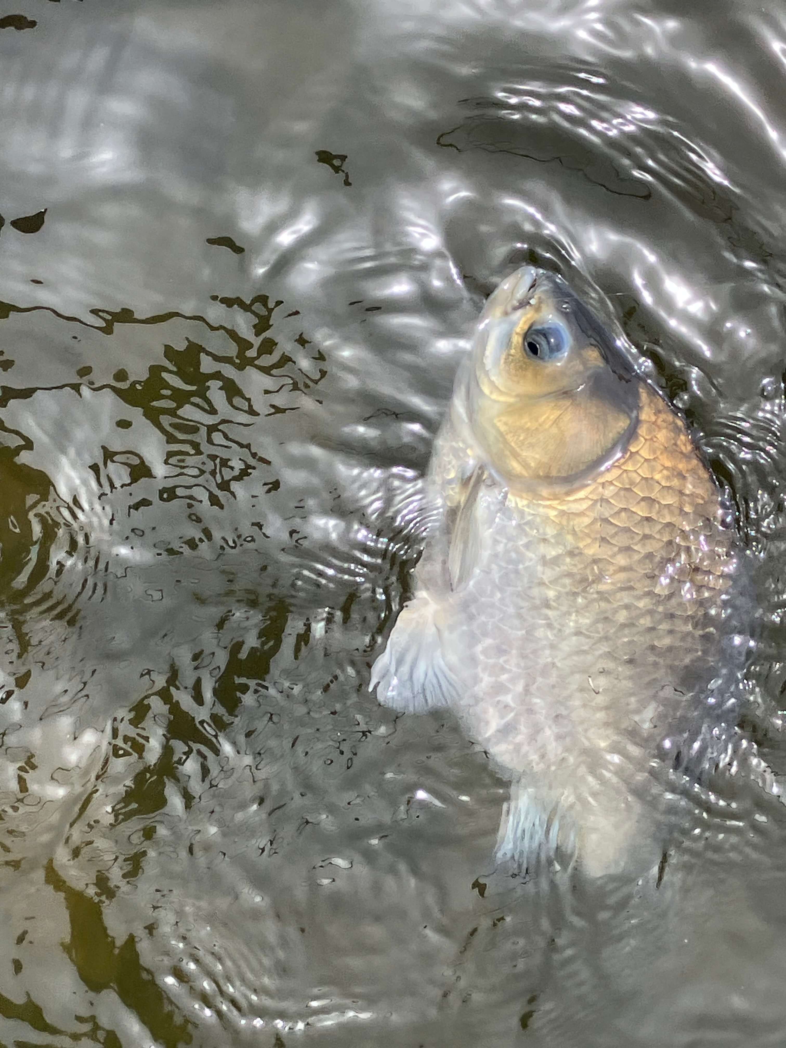 9時過ぎに両ダンゴのY氏が1枚目を絞る。その後、左側に入っている常連さんがバラグルの浅ダナで絞り、ドカンの手前の底釣りでも竿が曲がる。10時頃にやっとスバッと消し込み43cmがバラケを食って来た。