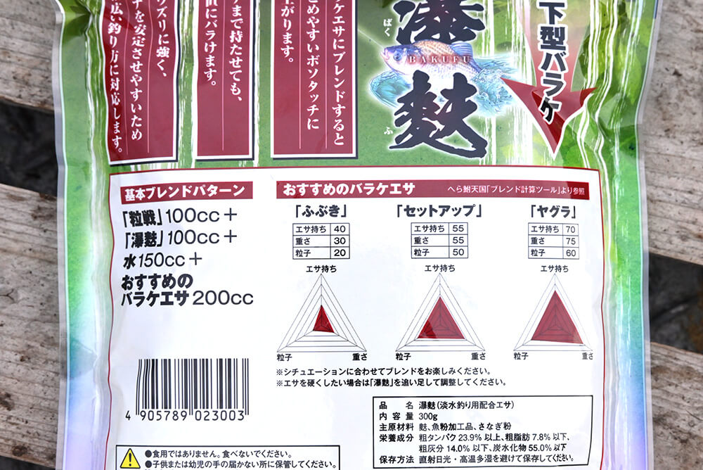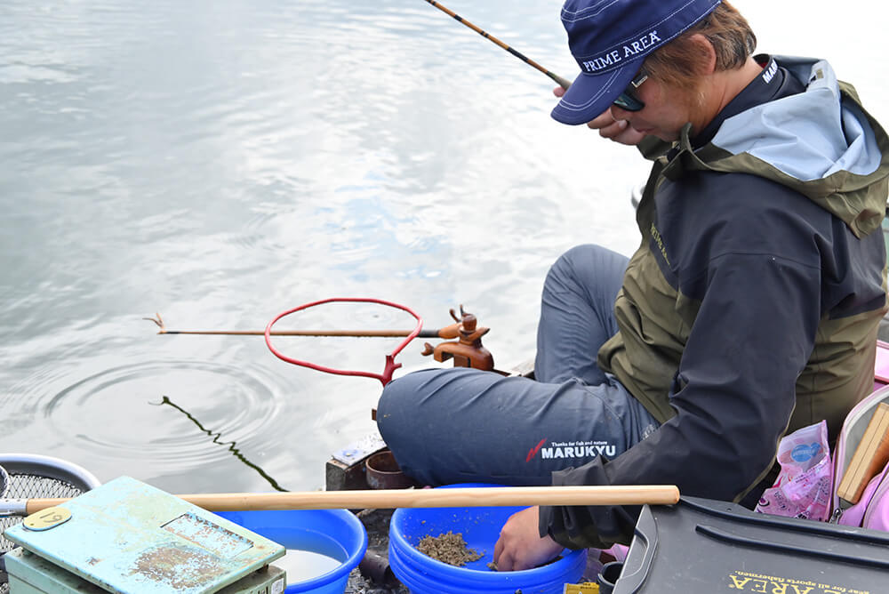 都祭によるとバラケをナジませる方法としてはおもに「重さ」「硬さ」「ネバリ」があり、状況によってどの手法を選択するかがキモだという。なお今回「ふぶき」「セットアップ」「ヤグラ」の3種の麩材を使ってそれぞれ比べてみたところ「ふぶき」が最もへら鮒の反応が良かったという。