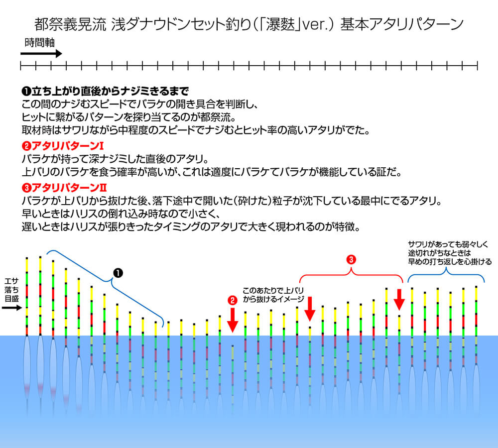 へら鮒の動きが鈍く食いも芳しくなかった序盤戦は、都祭自身が基本とするこうした組み立て方が思うようにできなかったが、後半に入り徐々に狙いどおりのウキの動きがではじめると、「速いスピードでナジむとアタっても空振りが多い」ことや、「遅いスピードでナジむとナジミが浅くアタリにつながらない」といった情報が彼の頭にインプットされる。その結果、理想のスピードでナジむようにタックルを含めてバラケを調整すると、速くもなく遅くもなく中程度のスピードで途中サワリながらナジミきった直後のズバ消し込みで上バリのバラケを食わせるヒットパターンが、ややあってバラケが抜けた直後のアオリに続いてでるアタリで下バリのくわせを食わせるヒットパターンが構築された。