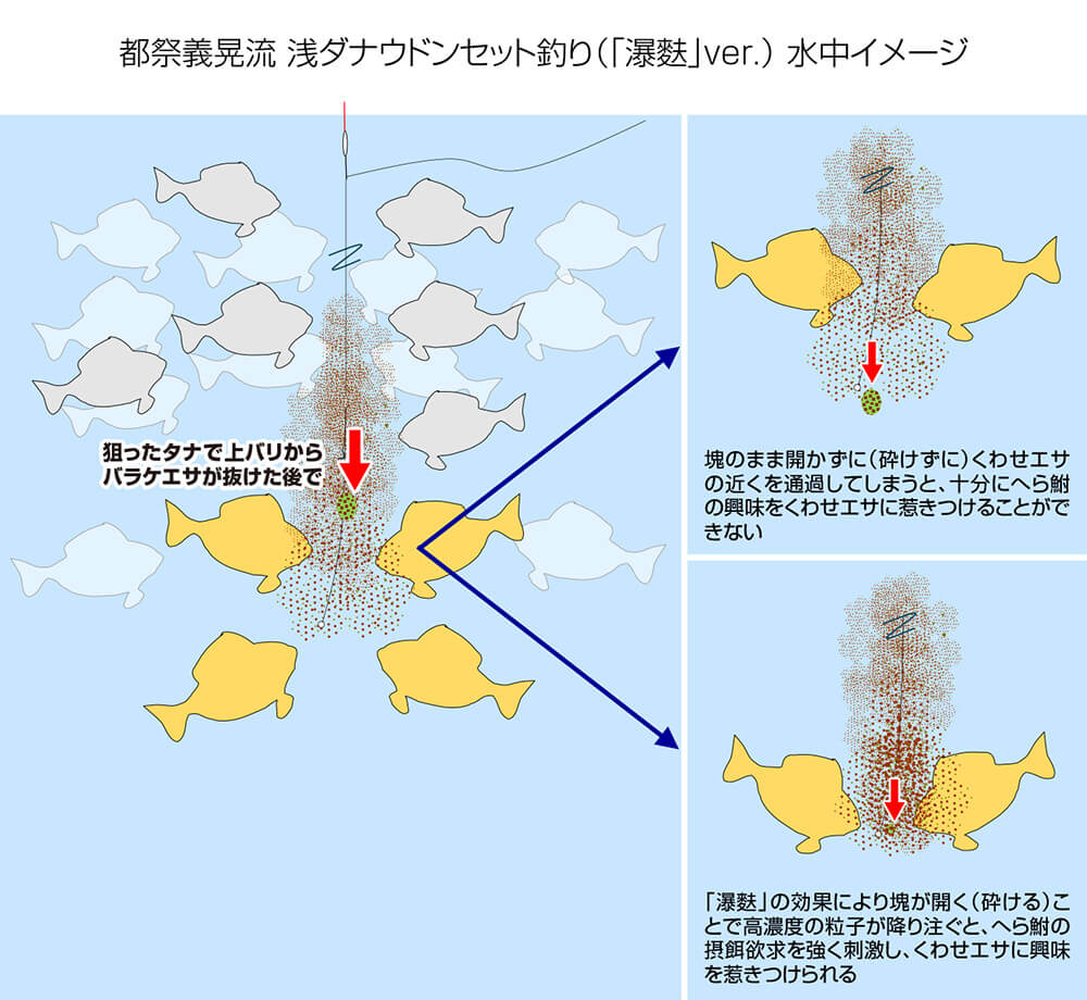 都祭義晃の「瀑麩」ファーストインプレッション(新エサの使い方) その三:練ったエサでも抜けた塊が砕け、滝のごとく降り注ぐからこそでるアタリ!