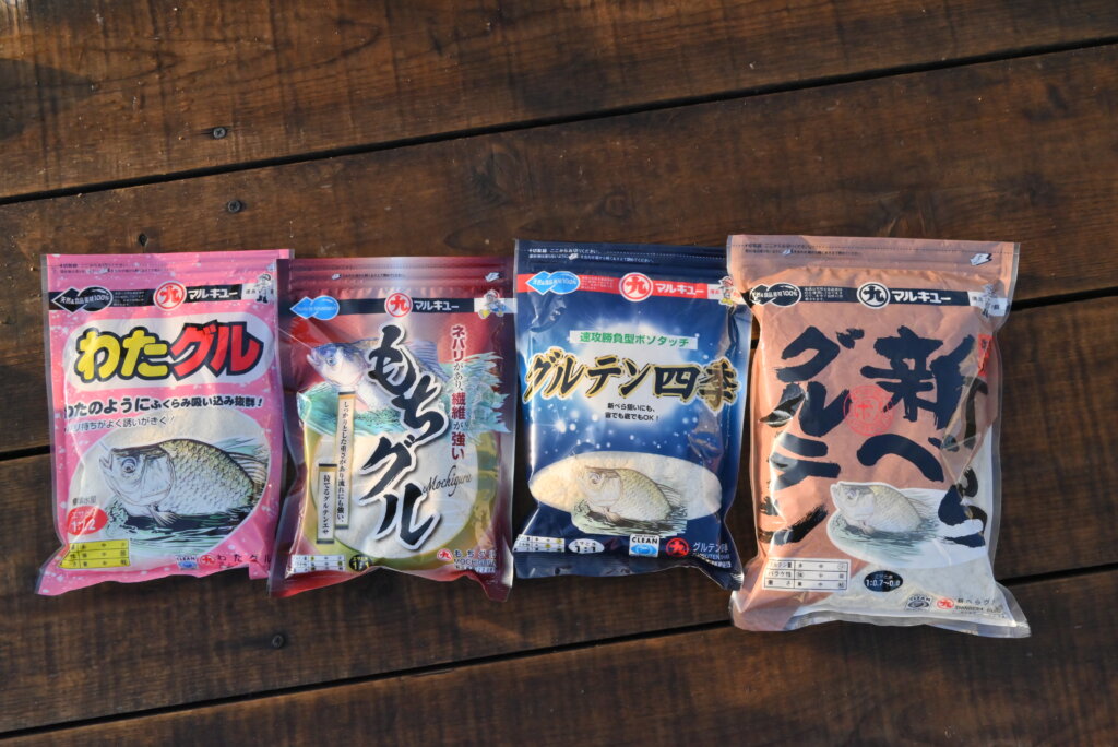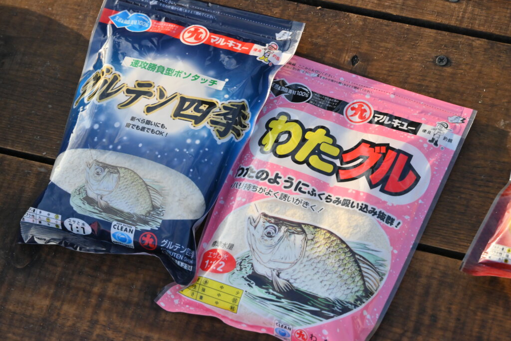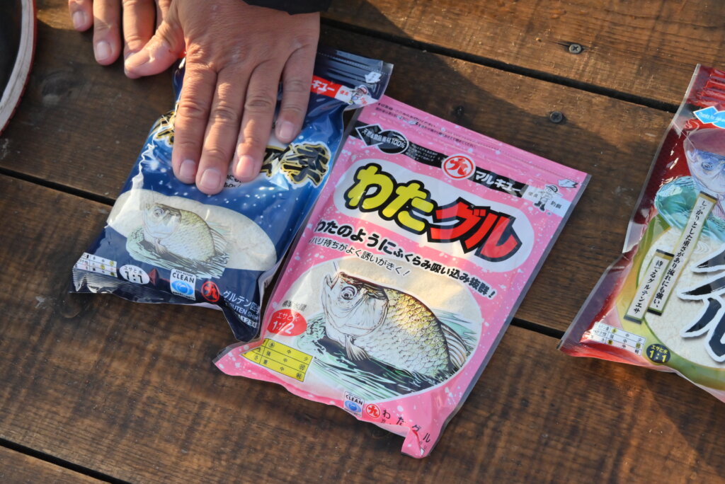 杉本先生:「このフレークみたいなのって“マッシュ”って言ってコロッケの中身みたいなやつ。バラけるエサなんだけど、それがこの中で多いのが『新べらグルテン』。逆にエサが持つようになるグルテンが多いのは『わたグル』。とりあえずこの4種があればいいかなと思って持ってきたよ。」