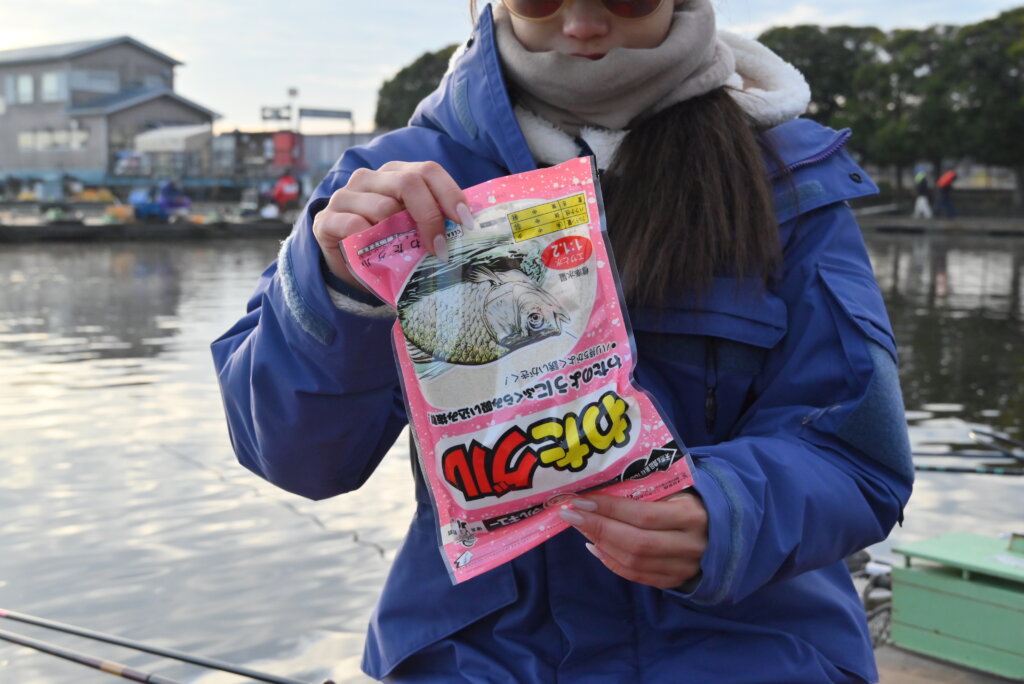 杉本先生:「ダンゴは集魚材が入っていて新べら以外も寄ってくる。ただ、今日釣りたいのは新べらで、彼らは養魚場で育ってここに来たばっかりだから、集魚力の無いグルテンで回遊する新べらを狙い撃ちさ!宙釣りだから今日はバラける『グルテン四季』に、持たせる『わたグル』でバランスを取ろうと思う。『もちグル』は重さもあって、よりハリにしがみつくグルテンだから、宙がダメで底釣りに変更するときに使おう。」
