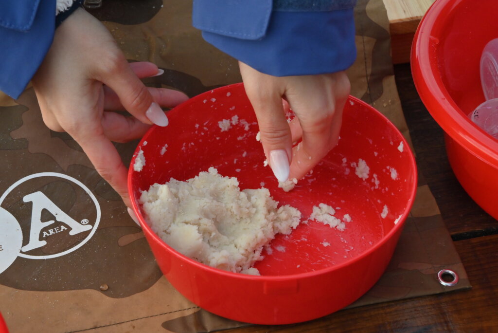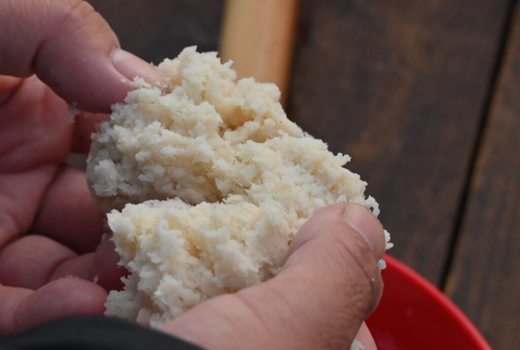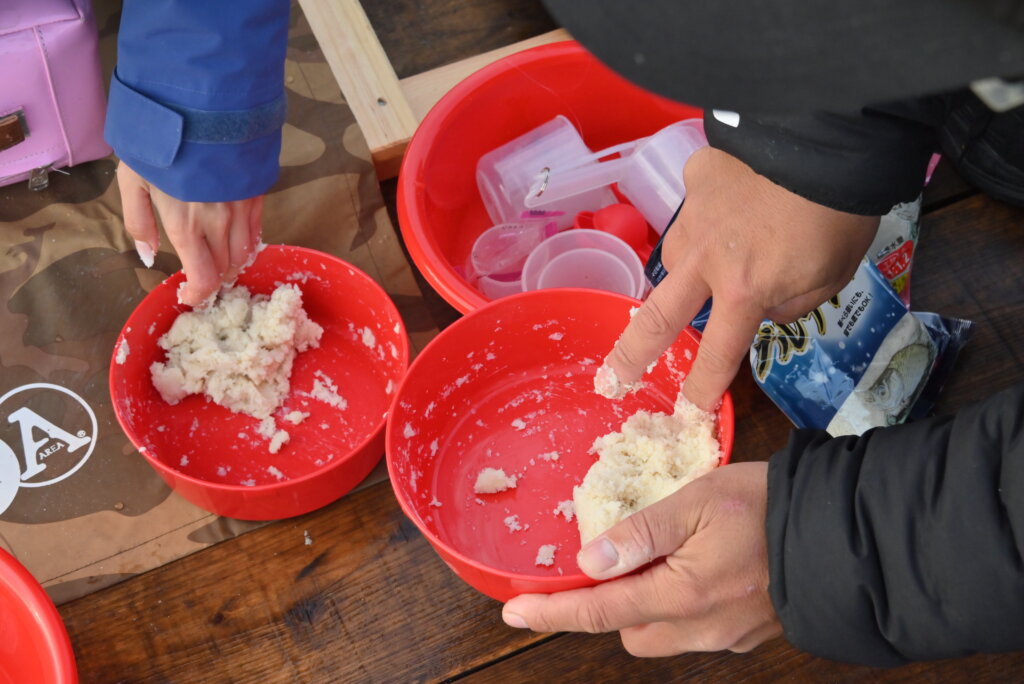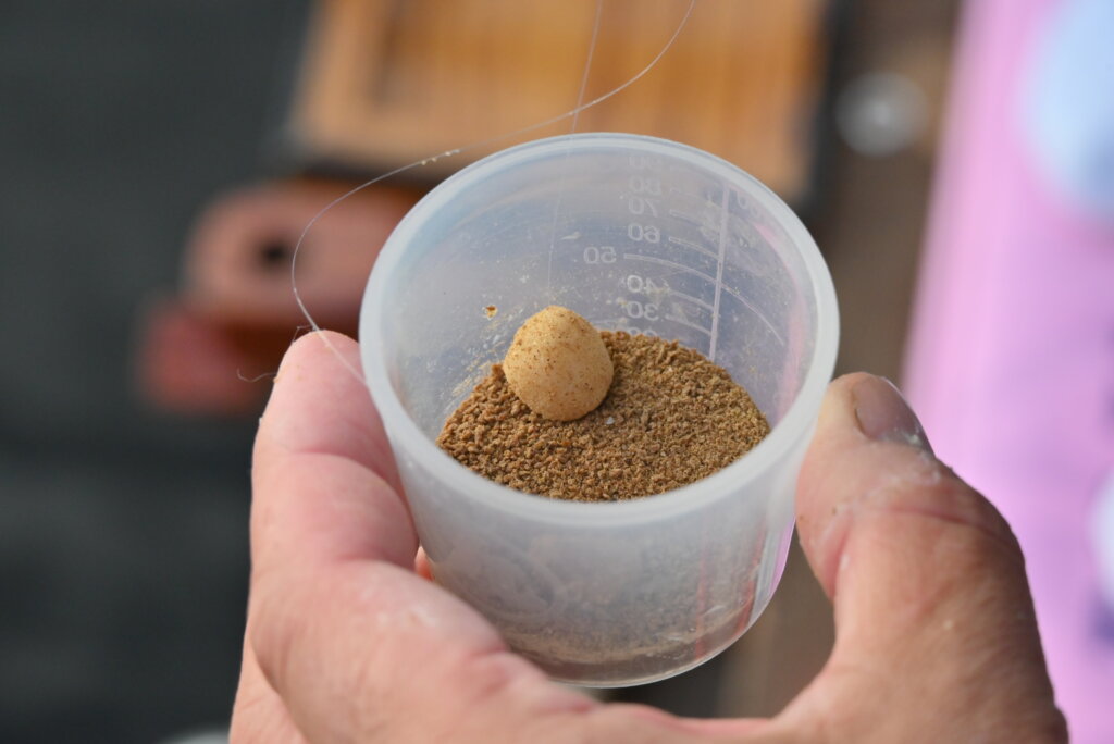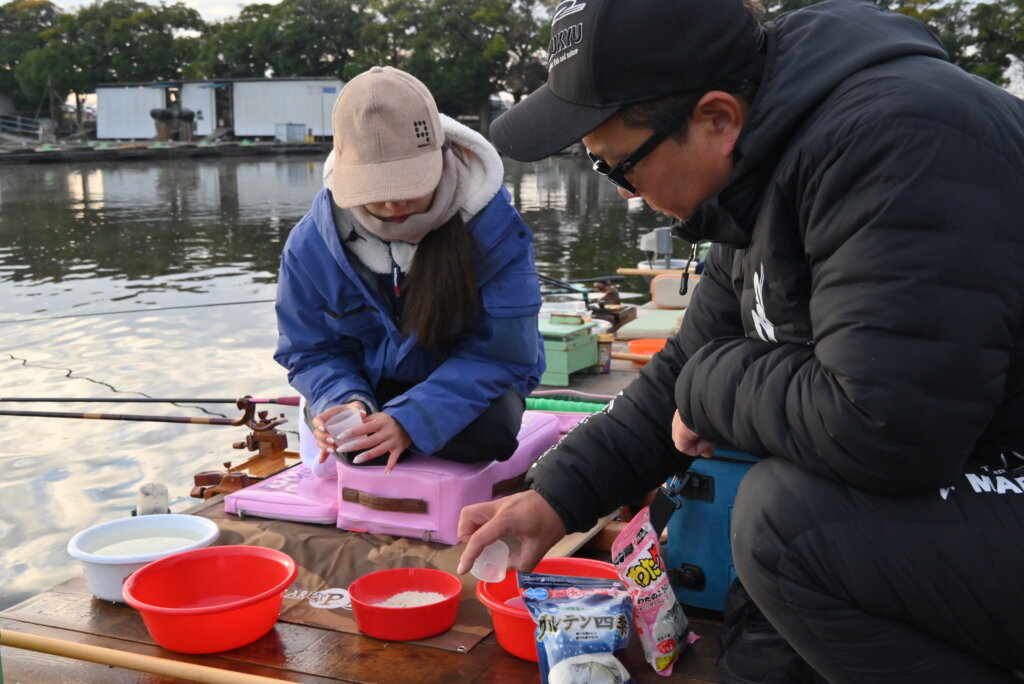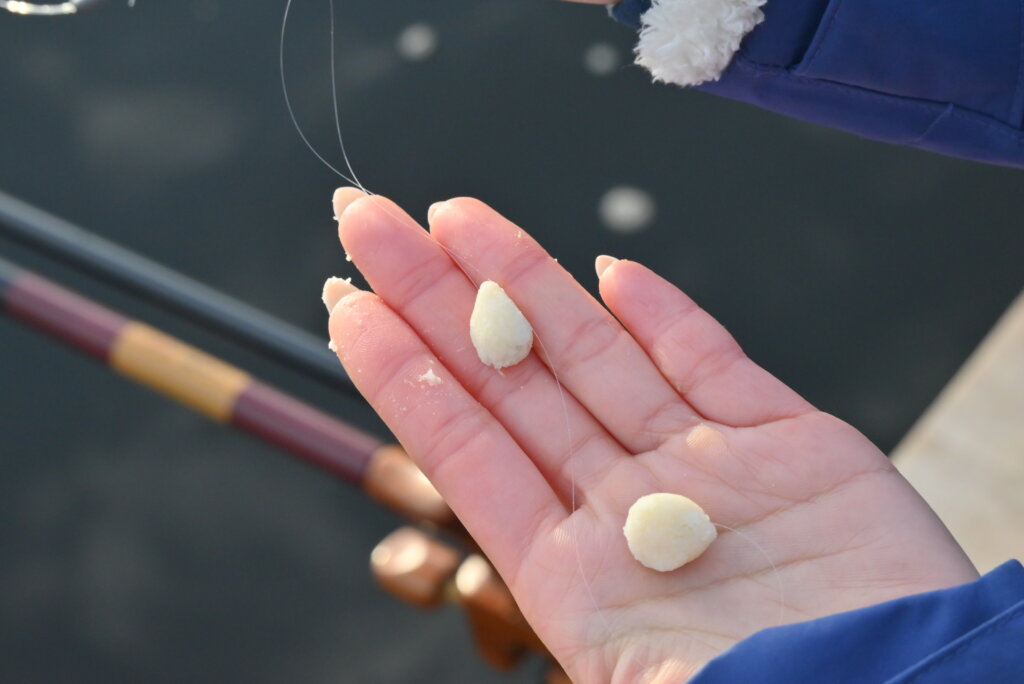 杉本先生:「こうやってグルテンエサは分けると糸引いてるでしょ?これがグルテン繊維で、これがあるから釣れるんだ。だから、なるべく作りたての状態をキープできるように、乾燥しないよう適宜エサを湿らせたり、こまめにエサを作り直したりしてね。」