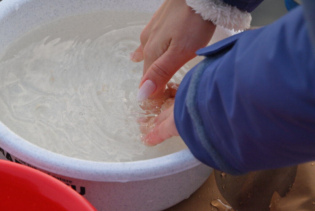 杉本先生:「ちなみにグルテン繊維がタオルにこびりついちゃうから、使い捨てのタオルがオススメだよ!エサを付けるときはこうやって手に水をつけてからエサを摘まむと手にこびりつかないよ。」