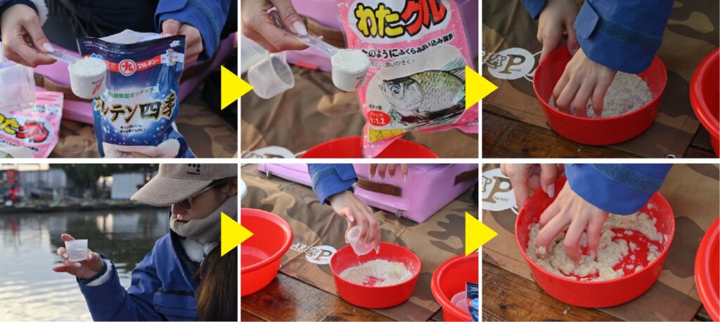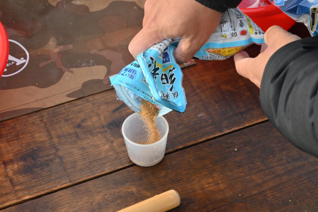杉本先生:「『わたグル』は使うときはよく袋を振ってね。そうしないと、グルテンとマッシュが袋の中でまばらになっちゃう。あと、グルテンエサっていうのは硬く作る方が水中でパッと膨らむから、粉1:1水くらいで作り始めようか。」