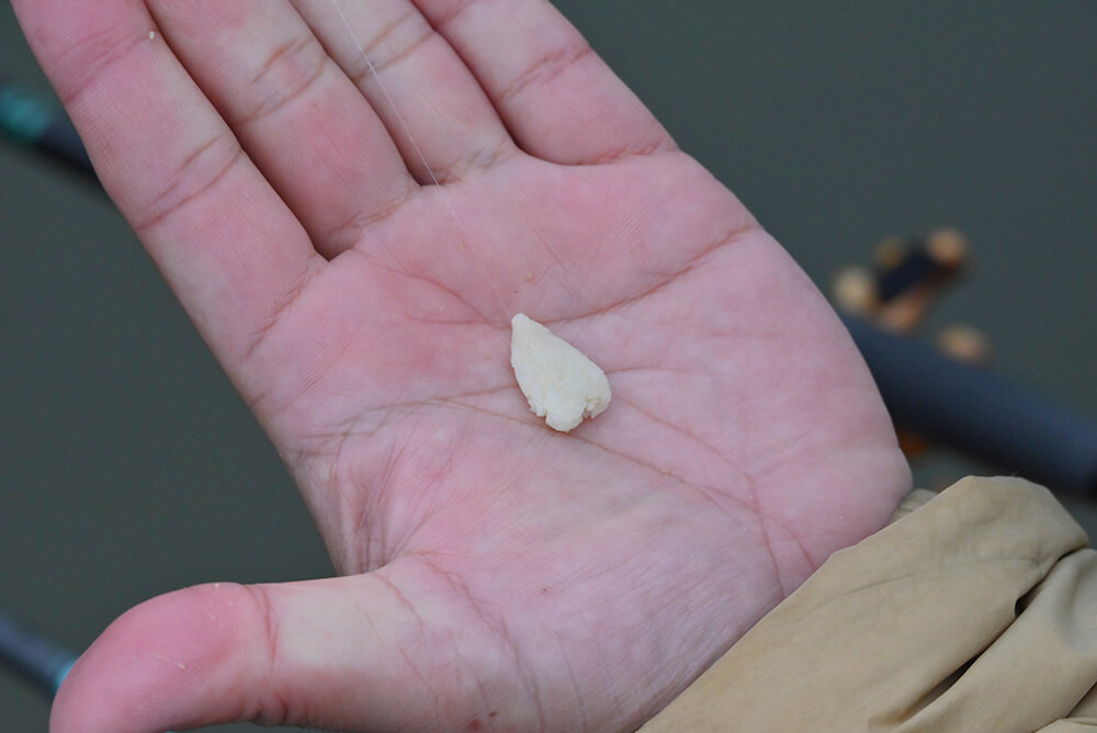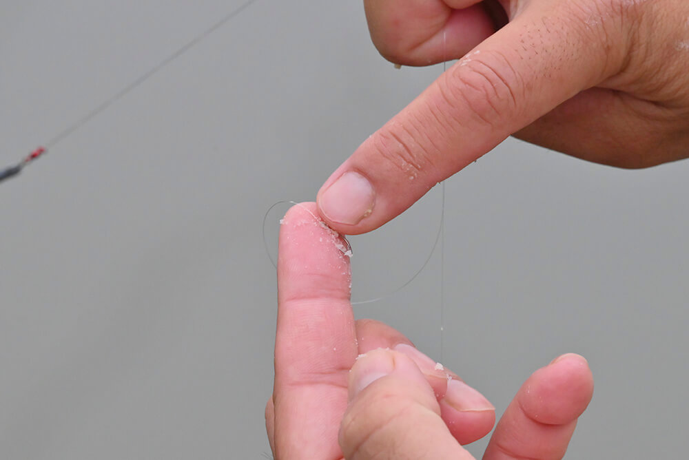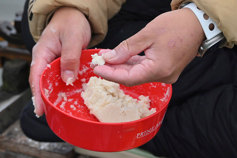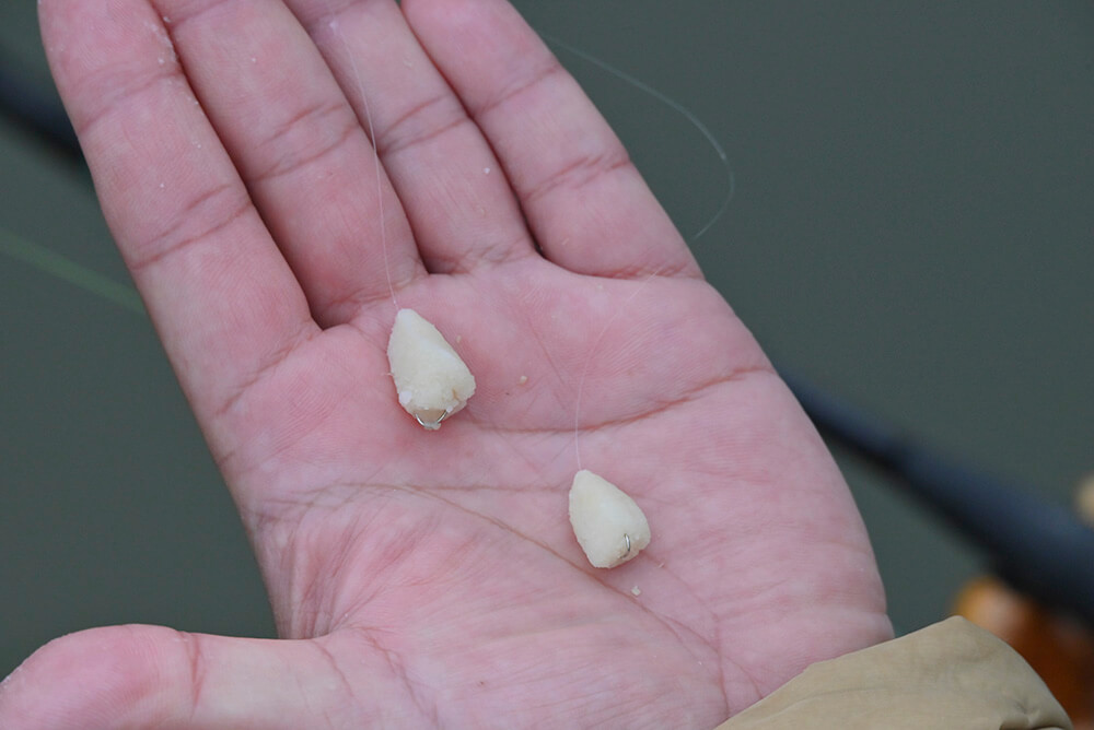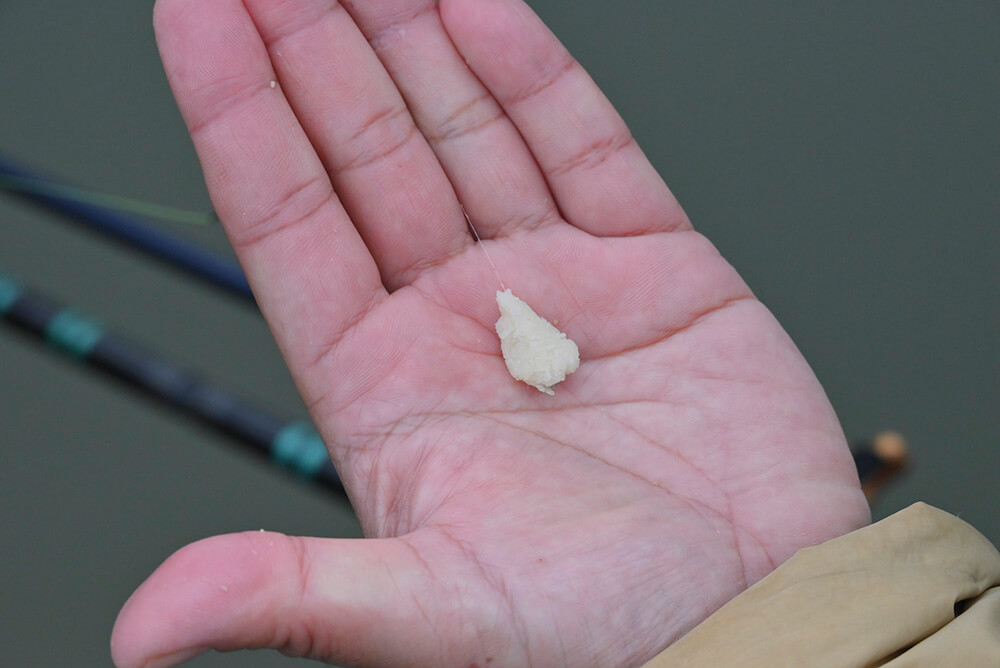 ❶エサ付けの準備段階において、つまみ取ったエサ玉内部のエアーを抜き過ぎないこと