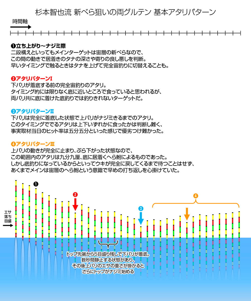 理想とする両グルテンの釣りのアタリは、トップのナジミ際からナジミきった直後までにでるカチッと小さくも鋭く入るアタリ。底釣りのアタリであってもウキが戻してくるまで待つことはほとんどなく、長時間待たなければアタリがでないような状態であれば、そもそも両グルテンでのこのマルチアプローチも、完全な底釣りも成立しない時合だと杉本は言う。