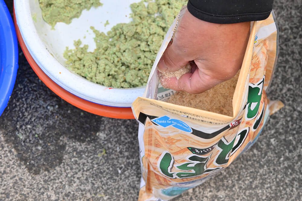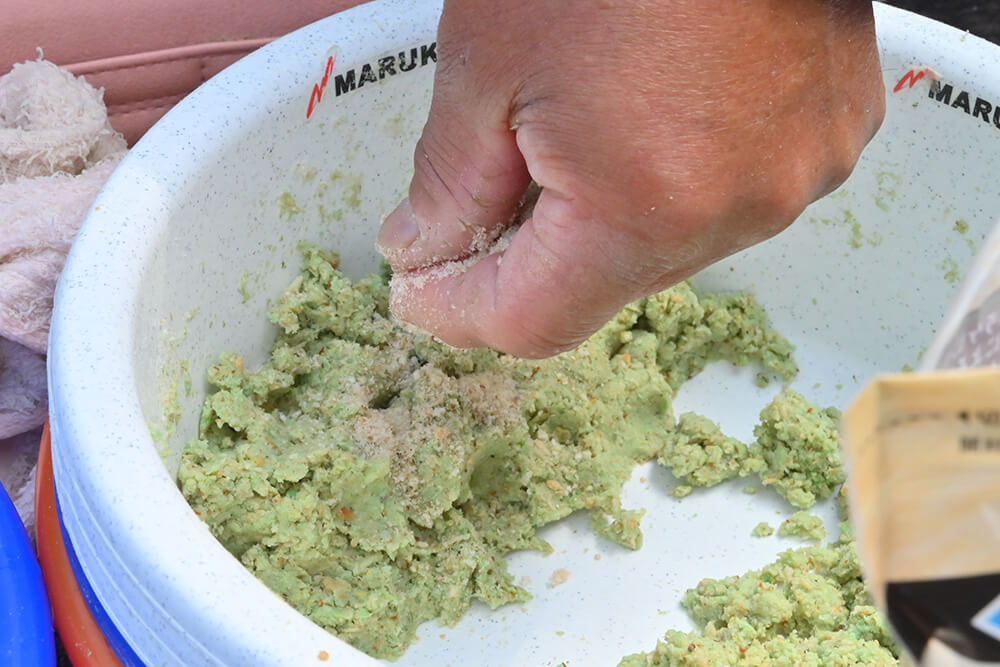 「従来の麩材のなかにも似たような特性を持つものもありますが、『ほどき』は比重が軽いため、ほかの麩材の特性を損なうことなく、むしろ相乗効果により食い頃のエサ玉をへら鮒に届けることができる点も秀逸です。使い方としては基エサ作りの時点で最初からブレンドに加えるもヨシ、途中で小分けしたエサに生麩状態で加えても効果を実感できる点も見逃せません」
