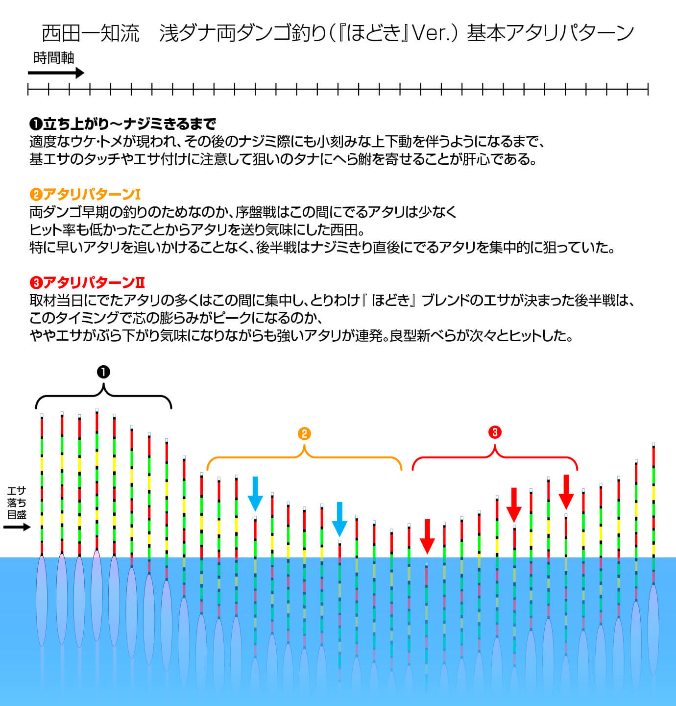 西田一知流「ほどき」を用いた浅ダナ両ダンゴ釣りのキモ その三:“この動きがでれば釣れる!”食いアタリにつながる必然の動きに注目!
