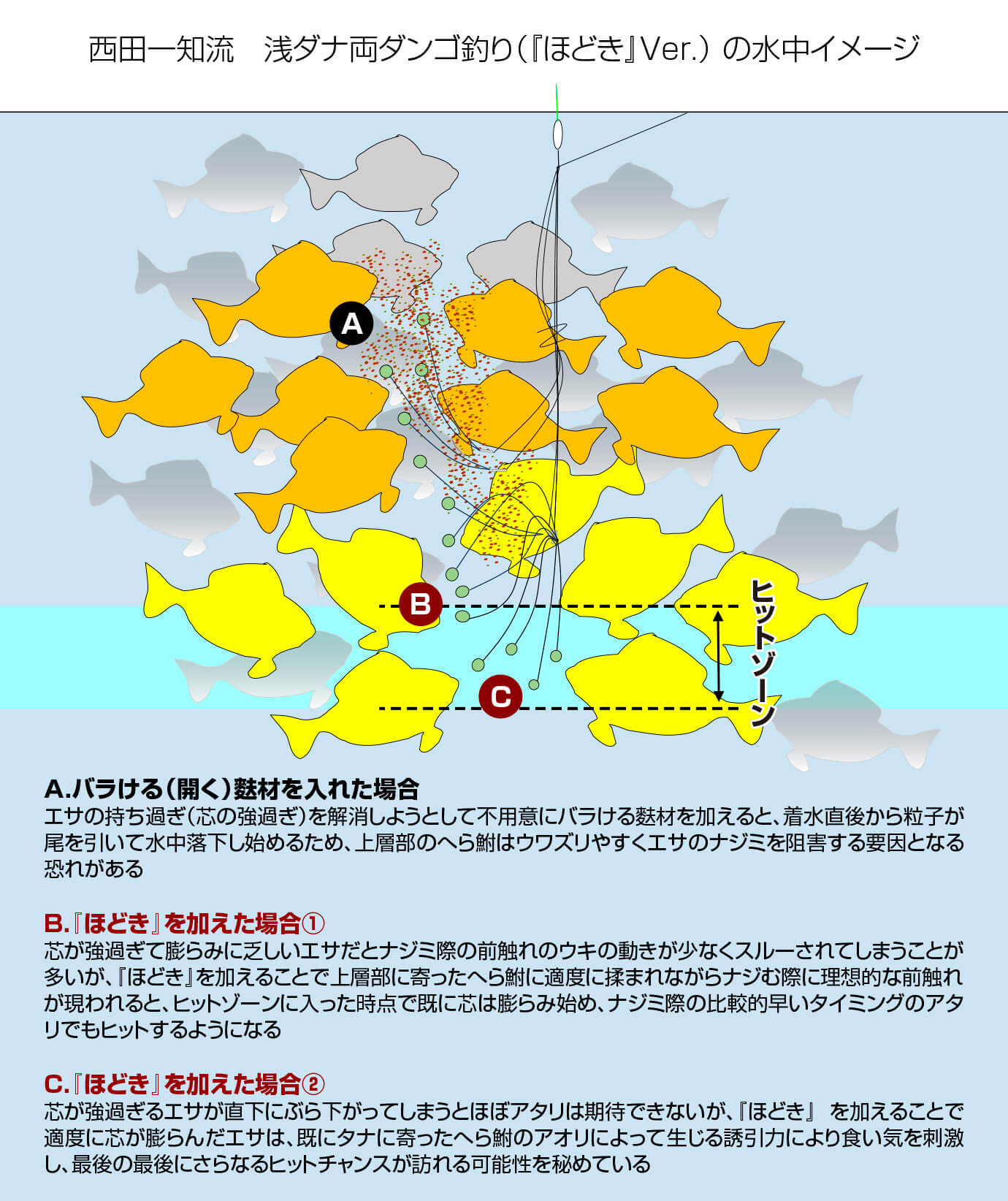 また西田は“バラける”と“ほどける”を混同してはいけないと力説する。“バラける”とはエサ玉の表面が水中落下中に粒子状に剥がれるイメージで、扱い方を一歩誤るとウワズリを助長させかねない。一方、“ほどける”は落下中の開きはほとんど見られないためウワズリにくく、タナ近くに来たときに適度に小さくなったエサ玉の中心部分が吸水により膨らみ、へら鮒が吸い込んだ際に違和感のない食感になるイメージと捉えれば良いだろう。